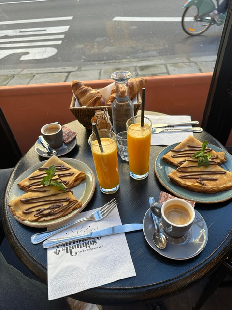 Boisson chaude, fruit pressé, viennoiserie ou tartine, œufs au plat ou omelette